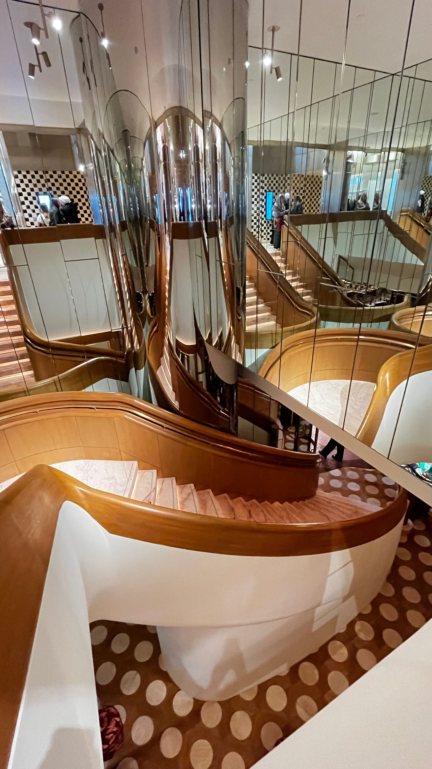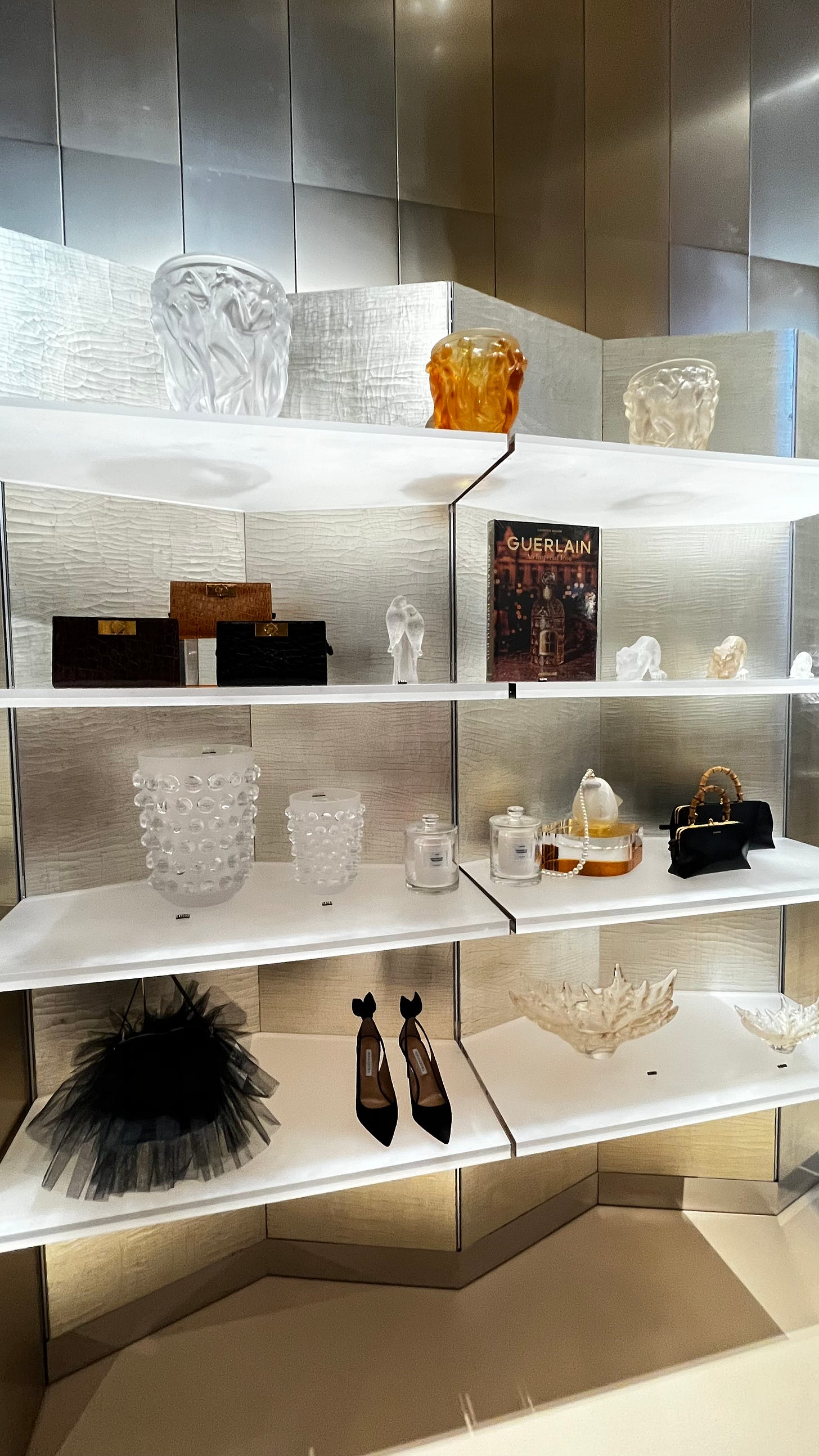 À chaque niveau, un univers. Un étage entier est consacré à l’art, avec une galerie qui présente des pièces signées Damien Hirst, Arik Levy, ou encore Zaha Hadid, dont les lignes puissantes dialoguent avec la délicatesse du cristal. Plus loin, on découvre un espace dédié aux parfums et bijoux, aux flacons sculptés et aux détails minutieux.