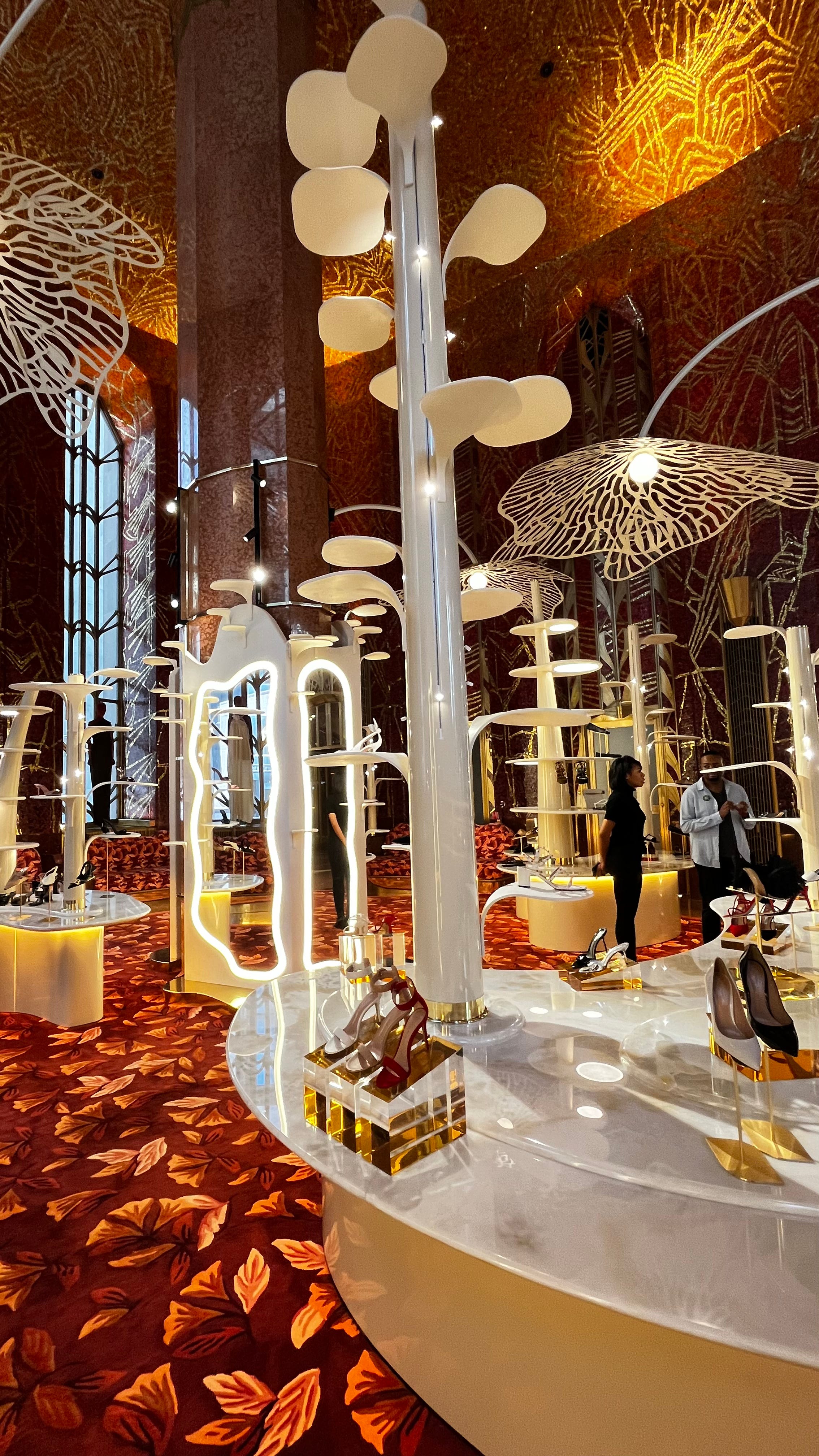 Et puis, il y a la Red Room, réinventée. Des fleurs géantes en jaillissent du sol, s’enroulent en étagères, s’élèvent en luminaires, comme si la nature et le luxe avaient fusionné pour réenchanter la ville. C’est peut-être ça, le secret du Printemps à New York : un souffle poétique, inattendu, où le passé se marie au présent dans un décor pensé comme une expérience sensorielle à part entière.