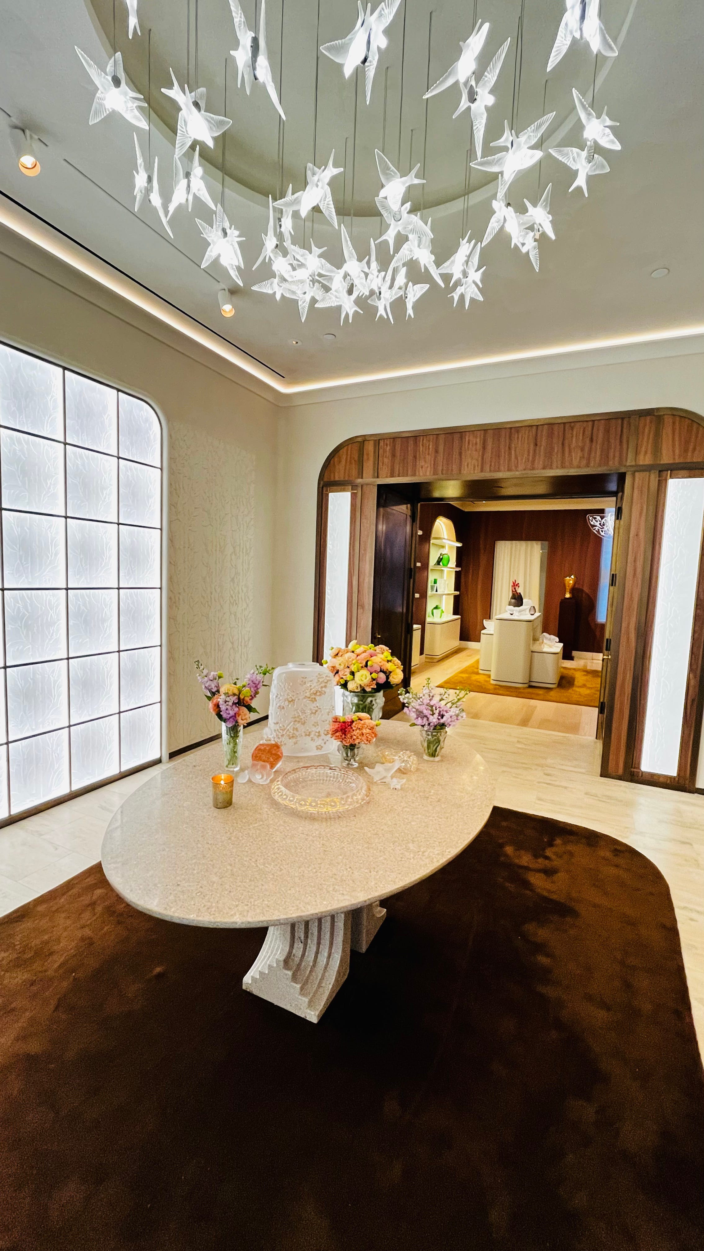 Mais ce sont les surprises qui émerveillent le plus : des oiseaux en cristal suspendus au mur grâce à un ingénieux système d’aimants, des luminaires-fleurs, des détails qui rappellent à chaque instant que Lalique n’est pas qu’une maison d’objets, mais une maison de poésie.